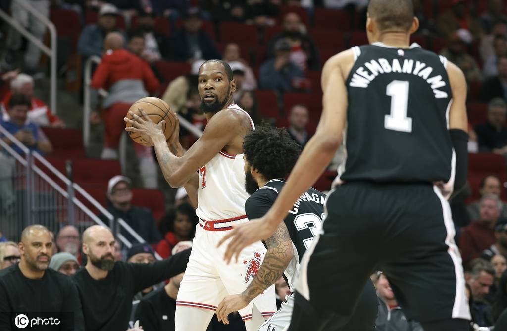 进入第四节,马刺已经彻底在气势上压制住了火箭队。马刺开局轰出一波11-0的攻击波,当杜兰特准备利用一次急停中投得分止住火箭队颓势时,文班亚马轻松封盖,这也让杜兰特直接摊手表示无奈。